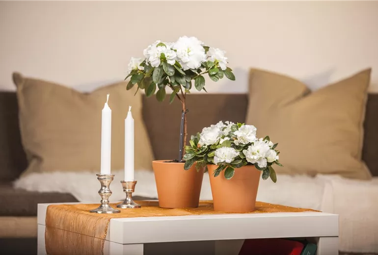Von den pflanzlichen Mitbewohnern möchte ausgerechnet die Azalee im Zimmer viel trinken. Ihr Name bedeutet „trocken“, obwohl sie ohne genügend Wasser nicht existieren kann. Das soll man der pflanzlichen Diva bitte regelmäßig zuführen, und sie hätte es gern gleichbleibend feucht. Dabei bevorzugt sie kalkfreies Wasser; von Regenwasser ist sie geradezu begeistert. Auch zu den Wärmeverhältnissen hat sie klare Vorstellungen. Bei 18 Grad hat die Azalee im Zimmer ihre Wohlfühltemperatur. Ein Aufenthalt im Wintergarten gefällig? Da sagt sie nicht nein. Sie möchte hell stehen, aber nicht direkt der Sonne ausgesetzt werden. Alle Wünsche erfüllt? Die Belohnung erfolgt mit wundervollem Blütenzauber zwischen November und März.