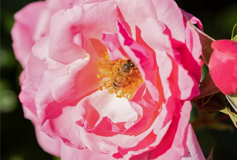 Damit die neuen Bewohner auf dem Balkon auch wirklich bienenfreundlich sind, sollte man wissen, woran man bienenfreundliche Balkonpflanzen erkennt. Denn dann kann man mit Kübel, Kasten und Co. für einen reich gedeckten Tisch sorgen und einen großen Teil zur Artenvielfalt beitragen. Was wären wir schließlich ohne die fleißigen Bienen, Hummeln, Wespen und andere Insekten, die bei der Bestäubung eine wichtige Rolle spielen und so vor allem in der Landwirtschaft nicht wegzudenken sind? Wir können unseren Teil beitragen und bienenfreundliche Balkonpflanzen auswählen. Die erkennt man in erster Linie daran, dass ihre Blüten ungefüllt sind und die Bienen und anderen Insekten ungehindert naschen können. Gefüllte Blüten hingegen versperren mit ihren Blütenblättern den Weg zu den Pollen und zum Nektar und sind daher für einen bienenfreundlichen Balkon eher ungeeignet. Am besten sieht man den Unterschied bei Rosen. Während Wildrosen einen gelben Punkt in der Mitte der Blüte haben und man dort deutlich die Pollen erkennt, sind gefüllte Edelrosen oft so dicht verschlossen, dass man nicht mal mit der eigenen Nase weit genug in die Blüte kommt, um daran zu riechen. Je freier der Zugang zur wichtigen Nahrung, desto bienenfreundlicher ist die Balkonpflanze!