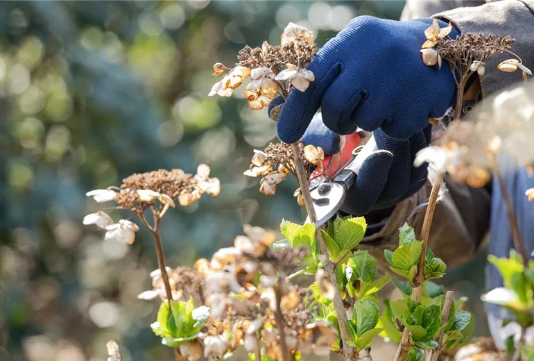 Zum Frühjahrsputz im Garten gehört auch der Rückschnitt einiger Pflanzen. Einige Stauden und Sträucher oder Gräser brauchen diesen Rückschnitt, damit sie im neuen Gartenjahr in voller Pracht zurückkommen und in neuem Glanz erstrahlen können. Bambus ist da ein gutes Beispiel, denn die Stiele und Halme sterben im Herbst und Winter ab und bevor dann im neuen Jahr die neuen Triebe zum Vorschein kommen, sollte man die alten entfernen, um Platz zu schaffen. Auch bei Stauden ist das der Fall, wenn oberirdische Pflanzenteile abgestorben sind und sich die Pflanze in die Wurzeln oder Rhizome zurückgezogen hat. Der Rückschnitt regt bei einigen Pflanzen auch das Ausbilden frischer neuer Triebe an, daher sollte man den Rückschnitt nicht zu früh ansetzen, damit die jungen Triebe nicht bei nächtlichen Frösten erfrieren. Wann genau welche Pflanze ihren Rückschnitt braucht, der zum Frühjahrsputz im Garten gehört, hängt ganz von Pflanzenart und -sorte ab. Es gibt also keine Faustregel, wann man mit der Schere durch den Garten gehen sollte. Hortensien z.B. unterscheiden sich je nach Sorte auch innerhalb der Pflanzengruppe und während Rispenhortensien einen Rückschnitt im Herbst brauchen, werden die alten Blütenstände der Bauernhortensien erst im Frühjahr abgeschnitten.