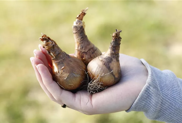 Narzissen sind nicht so nässeempfindlich wie andere Blumenzwiebeln. Deshalb sollte man darauf achten, wie die Bodenbedingungen sind, wenn man sie kombinieren möchte. In der Regel ist es aber kein Problem, Narzissen mit anderen Frühblühern wie Krokussen, Tulpen oder Schneeglöckchen zusammen zu pflanzen. So entsteht ein herrliches Frühlingsbeet. Nach der Blüte verhindern Sie die Bildung von Samenkapseln. Dann verbrauchen Ihre Narzissen keine unnötige Energie. Das Laub entfernen Sie erst, wenn es vergilbt und sich leicht lösen lässt. Sitzen die Narzissen im Rasen, sollte man diesen erst mähen, wenn das Laub verwelkt ist. Sonst schwächt das die Pflanzen und verhindert eine neue Blüte. Sollten Ihre Narzissen nach einer Weile weniger Blüten zeigen, nehmen Sie sie nach dem Vergilben aus der Erde und trennen Sie die Tochterzwiebeln ab. Diese können Sie neu setzen und wieder die gewöhnte Blütenpracht genießen.